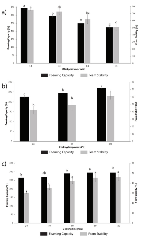 One hundred grams of cleaned and soaked chickpeas were placed in a sealed glass jar, then mixed with distilled water at different chickpeas to water ratios (CWR) and cooked for different times and temperatures according to the monofactor test experiments. After cooking, the aquafaba obtained was drained from cooked chickpea grains using a stainless-steel strainer, and then stored under refrigeration at 4 °C for 24 h. Prior to analysis the aquafaba was allowed to cool down to room temperature. Aquafaba was analyzed in terms of its foaming capacity and foam stability, and compared with canned samples.