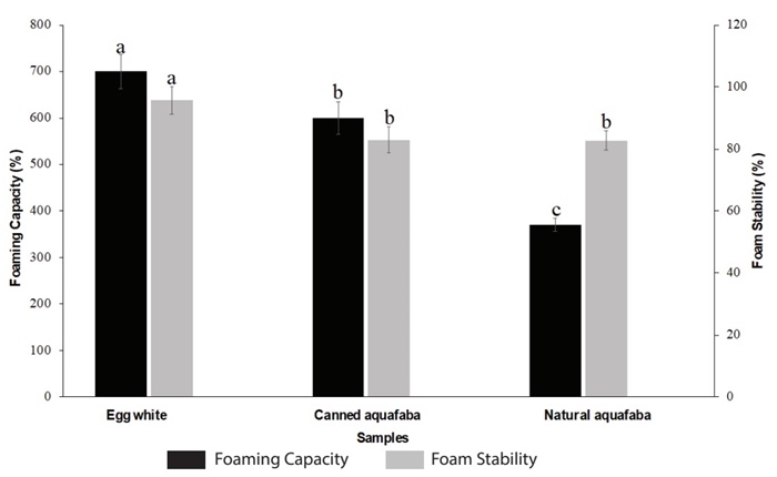 In the case of the aquafaba produced in this work (natural aquafaba) compared to the canned aquafaba, it was found that the latter has a better foam capacity; this can be explained considering the differences in industrial canning procedures (cooking conditions such as pressure, temperature, time, etc.) (He et al., 2021c; Alsalman and Ramaswamy, 2021; Alsalman et al., 2022), the use of additives, such as salt and preservatives, and genetic differences among cultivars used by manufacturers which can result in changes in aquafaba composition and its functional properties (Mustafa et al., 2018). Interestingly, no statistically significant differences (p>0.05) were found between foam stability of natural aquafaba and canned aquafaba. This may be due to the fact that both natural aquafaba and canned aquafaba have a similar content of protein (albumins, mainly) (Mustafa et al., 2018; Buhl et al., 2019) (as it can be seen in Table 1), which are surface-active agent (Shim et al., 2018) and that they were whipped for the same time. Whipping of this protein solution promotes the incorporation of air into the solution, which leads to bubble formation and adsorption of proteins at the gas-liquid interface to form protein-encapsulated bubbles. The shear force involved in whipping causes denaturation and coagulation of proteins on the air cell surfaces, increasing foam rigidity and stability (Mustafa et al., 2018). Similar results were reported by Mustafa et al. (2018), who studied aquafaba from different brands of canned chickpeas. Among their results, they found that, for example, brands A and B presented a foam capacity of 182.22 and 288.89 %, respectively, with a statistically significant difference between them; however, for foam stability, these aquafaba presented values of 77.2 and 77.5 %, for A and B, respectively, without significant statistical differences.