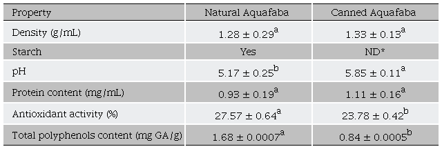 The natural aquafaba prepared in this work and the aquafaba from canned chickpeas were compared in terms of some of their physicochemical properties. As it can be seen in Table 1, no statistically significant differences (p>0.05) were found in protein content between natural aquafaba and canned aquafaba, and these results are consistent with the findings of Włodarczyk et al. (2022), Buhl et al. (2019), Mustafa et al. (2018) and Stantiall et al. (2018), who reported a protein concentration of 1.26, 1.3, 1.5 and 0.95 % of aquafaba, respectively. As mentioned above, the similar protein content between natural aquafaba and canned aquafaba could explain the similar behavior in the stability of the foam formed by both samples of aquafaba. Similarly, no significant statistical differences (p > 0.05) were found between the density values of the two samples studied, and such values are similar to those reported by Mustafa et al. (2018).