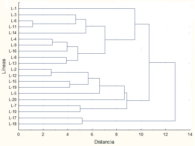 El método de UPGMA asume que las líneas son grupos por sí mismas, luego relaciona los grupos más cercanos basado en la matriz de distancias, recalcula la matriz de distancia y repite el proceso hasta que todas las especies estén conectadas a un único grupo, para generar el dendograma se utilizó el programa Statistic (versión 6.0). Para el gráfico se generó una matriz de datos X (IXJ) mediante los vectores a1, a2, a3….,ai para filas y b1, b2, b3…..,bj para las columnas de X, de forma tal que el producto interno aproxime el elemento Xij de la matriz de partida lo mejor posible, el cual considera el análisis para generar el biplot.
