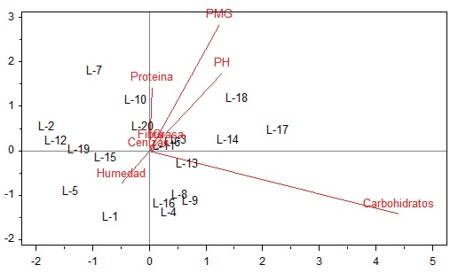 El tercer grupo conformado por L-1, L-5 y L-15 mostraron una relación negativa con el contenido de minerales (cenizas) y humedad en el grano. Este resultado es importante ya que, si la concentración de cenizas y humedad fueran mayor de 2.0 y 14 %, respectivamente sobre todo en granos con bajo PH, puede contaminar de manera significativa la sémola y la harina de la molienda. Los mayores niveles de contaminación con cenizas son particularmente indeseables en granos duros o cristalinos, en virtud de que las partículas oscurecen la semolina y, en mayor grado, las pastas alimenticias, el rango de cenizas en triticales es de 2.0 % para humedad, los contenidos en el grano mayores a 13-14 % favorecen el daño provocando la presencia de microorganismos (Zhu, 2018).