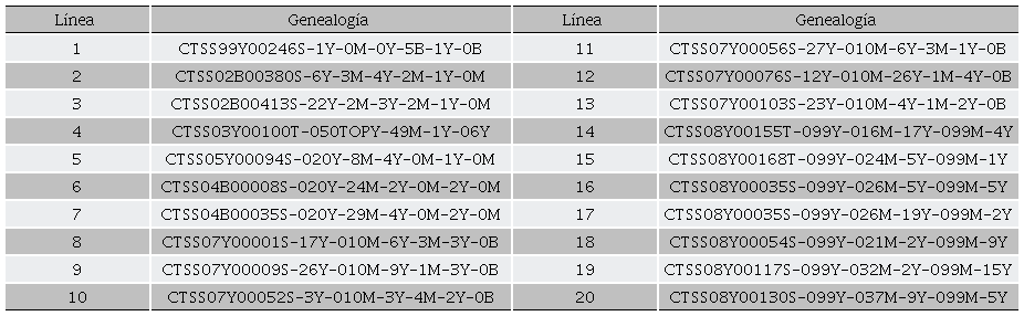 El experimento se llevó a cabo en el laboratorio de industrias alimentarias del Tecnológico Nacional de México, campus Roque en Celaya, Guanajuato, México, en el 2018 con las siguientes coordenadas geográficas, a 20º 31’ Latitud Norte, 100º 45’ Longitud Oeste y 1765 msnm. El material genético que se utilizó fueron 20 líneas élite de triticales de hábito primaveral de generación F8 que fueron seleccionadas en el campo experimental del CIMMYT, Norman E. Borlaug en Ciudad Obregón, Sonora, del vivero YTCL-2015 en abril 2017 (Tabla 1). Posteriormente estas líneas fueron sembradas en el campo experimental del Tecnológico Nacional de México-Roque en noviembre 2017, donde se obtuvo información de rendimiento de grano, altura de planta, número de espigas, peso de mil granos y peso hectolítrico principalmente. Posteriormente a la semilla de cada línea se realizaron los análisis fisicoquímicos en el laboratorio de industrias alimentarias del TecNM-Roque, las variables evaluadas fueron: peso de mil granos (PMG), peso hectolítrico (PH), humedad, cenizas, grasa, fibra, proteína y carbohidratos.