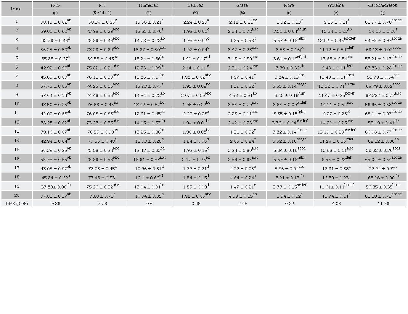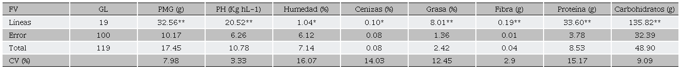 En el Tabla 2, el análisis de varianza indicó diferencias significativas para líneas en todas las variables en estudio. Los efectos que contribuyeron más a la variación total entre las líneas de acuerdo con los cuadrados medios del error fueron en carbohidratos, peso de mil granos y peso hectolítrico, humedad y proteínas. Esto fue debido a la expresión entre las líneas (Fraś et al., 2016), donde se encontraron diferencias en propiedades físicas como PMG y PH en líneas avanzadas de triticales.