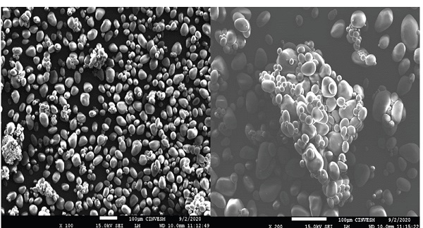 The starch sample showed a wide particle size distribution ranging from 14 to 69 µm, as well as an oval shape with a smooth surface (Figure 1). Conglomerates can be observed as a result of electrostatic charges between large and small particles. In this sense, Morales (2012) mentions a size of 5 to 100 µm for potato starch particles, while Ramíreza et al. (2017) reported an average size of 27.1 µm.