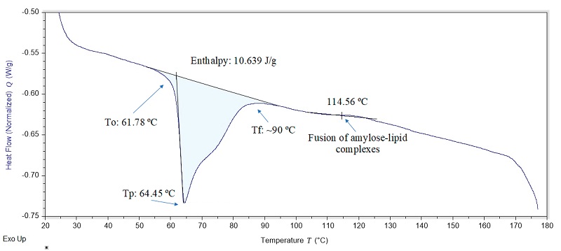 In the present work, an endothermic peak was observed at 114.56 ºC, attributed to the dissociation of the amylose-lipid complex. In this sense, Genkina et al. (2014) reported a peak around 95 ºC for corn starch and mentioned that the fusion of these complexes is a reversible process, contrary to the phase transition of amylopectin. These changes in the transition temperature of starch are attributed to its botanical source, its crystallinity and composition, since the amylose content is negatively correlated (Li et al., 2017; Han et al., 2019). Furthermore, lipids are a determining factor, since their presence results in a gelatinization process at higher temperatures (Alvani et al., 2011).