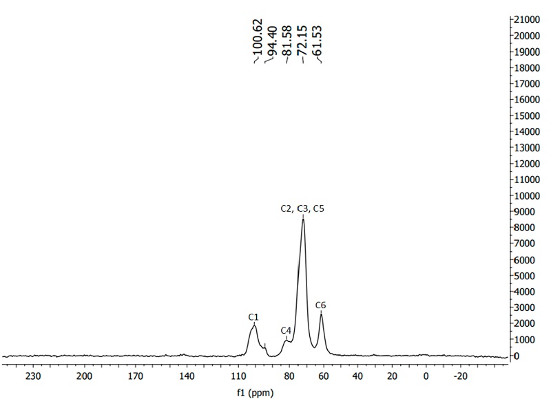 Figure 4 shows the 13C NMR spectrum of potato starch in the range of - 20 to 230 ppm. The NMR spectrum detected the presence of five peaks between 60 - 105 ppm. The peak recorded around 60 ppm is due to carbon 6 of the glucose unit, while the wide peak observed between 70 and 80 ppm is related to carbons 2, 3 and 5, C4 was detected at 80 ppm, while carbon 1 presents two peaks around 100 of ppm, thus corroborating the structure of the starch monomer (glucose) (Thérien-Aubin et al., 2007; Šoltýs et al., 2019).