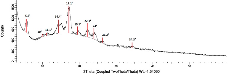 As shown in Figure 5, the diffraction showed type B crystallinity patterns typical of potato starch, with a strong diffraction peak at 17.1° and low intensity peaks between a range of 5.6 - 26.2°, corroborating the results obtained by NMR. The degree of starch crystallinity was estimated at 34.73 %, values similar to those reported by Núñez-Santiago et al. (2011) and Gui et al. (2022) who reported 32.3 % and 31.5 % crystallinity, respectively, for commercial potato starch in both cases.