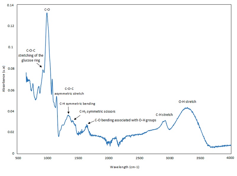 The glucose (starch monomer) structure previously detected with NMR, was corroborated with the detection of their functional groups by FTIR-ATR spectrophotometry (Figure 6). Signals were observed at wave numbers of 763, 858 and 929 cm-1, which are attributed to the stretching of the ether groups (C-O-C) of the glucose ring, in addition, the band observed between 993-1082 cm-1 was due to the C-O bonds stretching. The presence of an absorption band around 1157 cm-1 indicated an asymmetric stretching of the C-O-C groups. Symmetric double vibration of C-H bonds and symmetric deformation of CH2 groups were observed at wavelengths 1381 and 1437 cm-1, respectively. The absorption band around 3300 - 3600 and 2900 cm-1 indicated the presence of hydroxyl functional groups (-OH) and C-H bonds, respectively. The C-O bending associated with the -OH groups showed an absorbance peak around 1648 cm-1. The absorbance peak at 1415 cm-1 implies the presence of a symmetric scissors of the CH2 groups. The unusual CO2 peak (2358 cm-1) observed in the starch IR spectrum could be the result of the measurement conditions (Torres et al., 2015; Abdullah et al., 2018).