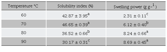 An increase in starch solubility index has been reported with increasing temperature (Martínez et al., 2017), however, in the present work the maximum solubility index values were reached between 60 °C and 70 °C, with a decrement at 80 °C and 90 °C. Guizar et al. (2008) reported a similar behavior, with maximum solubility index values between 70 - 80 °C, and a subsequent decrease at 90 °C for sweet potato starch, attributed to the fact that when reaching the maximum solubility, the starch components (amylose-amylopectin) begin to interact with each other forming insoluble complexes, which precipitate decreasing the solubility index.