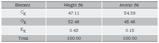 Scanning electron microscopy with energy dispersive detector (EDS) allows knowing part of the simple chemical composition of starch (Table 3). The potato starch sample showed a simple composition of 54.39 % carbon, 45.46 % oxygen, and 0.15 % potassium. Bahrami et al. (2019) reported a similar chemical composition for potato starch, with 59.31 % carbon and 40.69 % oxygen, while Hernández et al. (2017) indicated a composition of 76.43 % carbon and 23.23 % oxygen. The potassium detected in this test is due to the composition of the starch, since the presence of minerals such as calcium, magnesium, sodium, iron, phosphorus, and potassium has been reported (Meaño et al., 2014).