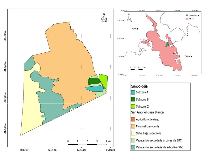 La comunidad de SGCB, municipio de San Antonio Nanahuatipam, Oaxaca (17°39’-18°53’N y 96°55’-97°44’O), tiene una superficie de 5900 ha-1 dentro de la RBTC (Figura 1). El clima es caluroso semidesértico con temperatura anual de 25 ºC a 30 ºC y la mayor precipitación ocurre en verano con 438 mm (CONANP, 2013); la estación seca comprende de enero a junio y la lluviosa de julio a diciembre. La vegetación es selva baja caducifolia y matorral crausicaule, con pequeñas áreas de pastizal inducido y cultivos (CONANP y FMCN, 2003; CONANP, 2013).