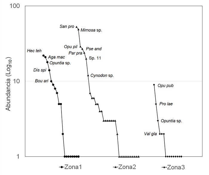 La vegetación en las tres subzonas va desde matorral crausicaule a selva baja caducifolia. En los transectos se contabilizaron 53 especies de plantas, teniendo la subzona A 19 especies, siendo Hechtia tehuacana la especie dominante (Figura 2); en la subzona B se registraron 32 especies, con dominancia de Sanvitalia procumbens; y en la subzona C se registraron 15 especies, con dominancia de Opuntia pubescens. No se pudieron clasificar 18 especies debido a la baja abundancia y/o a la falta de estructuras (flores o frutos) para su identificación.