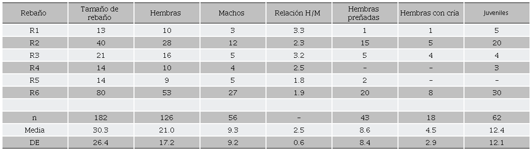 Mediante entrevistas y observaciones directas a los seis productores de la comunidad SGCB se recabó información de las características del rebaño (número de hembras, hembras con cría, machos y juveniles; Tabla 1), y las actividades y características del pastoreo entre febrero y octubre del 2017. Se registró el tiempo de duración del pastoreo y las especies vegetales consumidas. Además, se tomaron coordenadas geográficas en diferentes puntos de la ruta de pastoreo para estimar el área, y en cada punto, se registraron las especies vegetales y su frecuencia en tres transectos de 50 m de longitud. La dominancia fue evaluada con curvas de Whittaker y la diversidad con el índice de Simpson (λ) (Magurran, 2004); se compararon los sitios con una prueba de t con ajuste de Hutcheson.