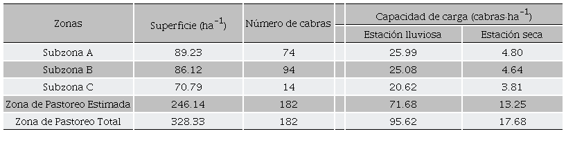 Aunque se han realizado algunos estudios de vegetación y alimentación de rebaños de cabras en la región de la Cañada (Mandujano et al., 2019), no se han realizado estimaciones de la capacidad de carga, ni una valoración de la presión que ejerce el pastoreo en la vegetación nativa. Comúnmente la capacidad de carga está basada en el coeficiente de agostadero con base en la vegetación nativa y en años con precipitación normal, que para Oaxaca es de 4.12 ha-1·Unidad Animal al año (COTECOCA, 2014) (1UA = vaca de 400 - 450 kg; una cabra equivale a 0.17 UA; SAGARPA, 2000); considerando este valor, la vegetación en la SGCB puede sostener 1.43 cabras·ha-1 al año en forma permanente y sin deteriorar los recursos naturales. La vegetación cambia no solamente entre años sino entre estaciones por la disponibilidad de lluvias y la fenología de las plantas, esto hace que las cabras tengan que moverse más en la estación seca para cubrir sus requerimientos (Pérez-Solano y Mandujano, 2018). En el tiempo de investigación se observó que 74 cabras (3 rebaños) pastan en la subzona A; a la subzona B solo van 94 cabras (2 rebaños), y en la subzona C únicamente fue visitado por 14 cabras (Tabla 2).