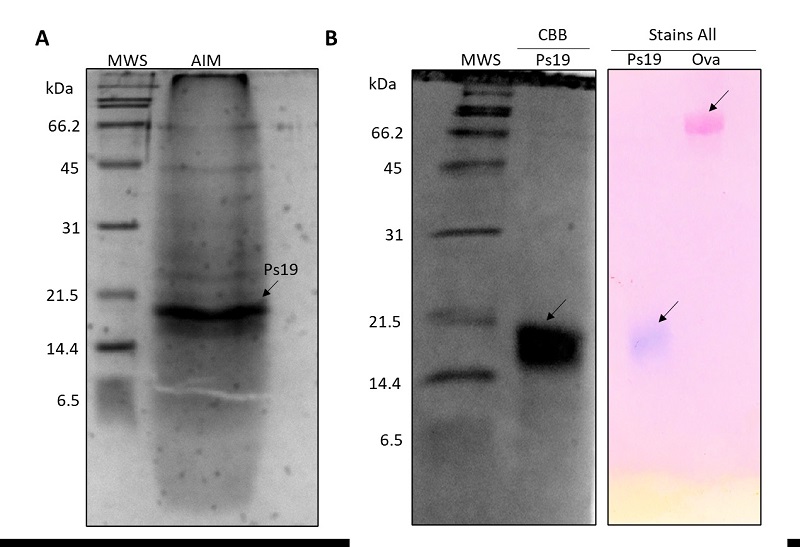 The acid-soluble (ASM) and acid-insoluble (AIM) matrixes were obtained by extraction with cold acetic acid. The AIM was separated by denaturalizing electrophoresis and visualized by CBB stain (Figure 1A). The Ps19 protein was identified by determining its molecular weight (~19 kDa) through its relative mobility along with the gel.