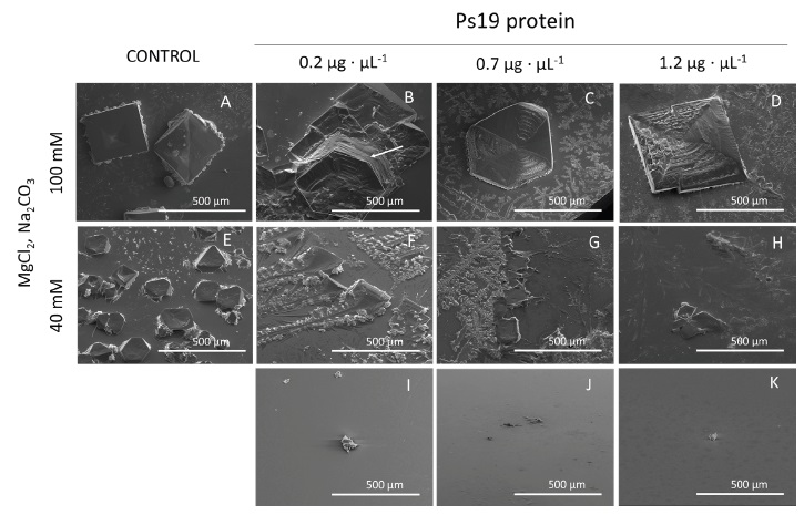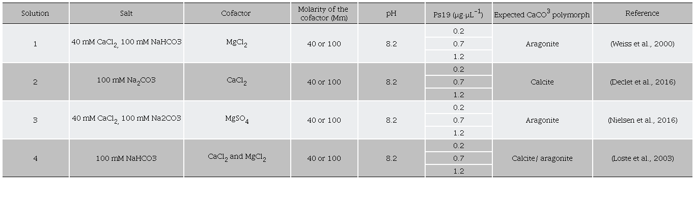 Calcium carbonate (CaCO3) crystallization in the presence of Ps19 was evaluated by the incubation of four saturated solutions and three differente protein concentrations that shown in Table 1. Each combination (10 μL of Ps19 and 50 μL of saturated solution) was placed over a glass coverslip inside a Petri dish with absorbent paper at the bottom to prevent condensation. The Petri dishes were sealed with parafilm, placed into a container, and incubated for 30 days at 4 °C. Controls and solutions 1 to 4 (50 μL) were mixed with sterile distilled water (10 μL) instead of Ps19 and the protein by itself (10 μL) was mixed with 50 μL of sterile distilled water. The morphology of the crystals was analyzed by Scanning Electron Microscopy (SEM) at the Electronic Microscopy Laboratory at Centro de Investigaciones Biológicas del Noroeste (CIBNOR), México. Every experiment and analysis were performed by triplicate.