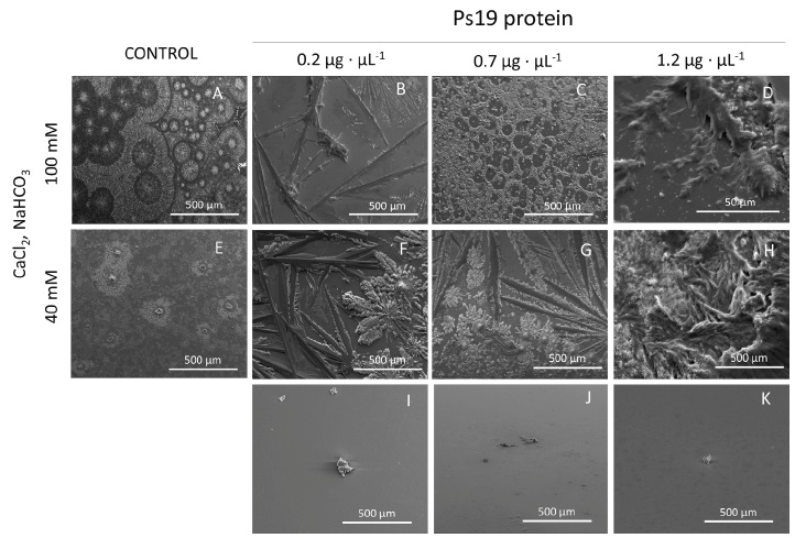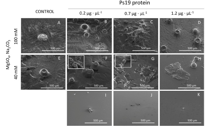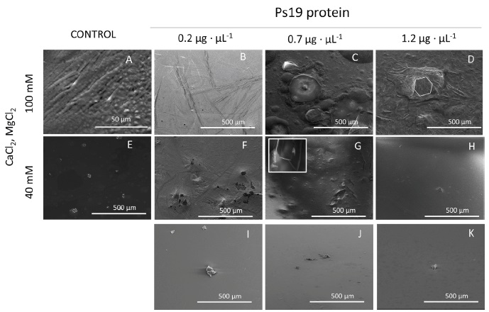 The modulation of CaCO3 crystal polymorph formation by Ps19 was evaluated by SEM. The Ps19 protein was able to produce calcite crystals when MgCl2 was used as a cofactor at 40 and 100 mM (Figure 2). At 40 mM MgCl2, Ps19 crystallized calcite crystal plates in their typical geometric shape with smooth sides (Figure 2 F-H), which were comparable in size than those observed in the controls (Figure 2E, 3I-K). At 100 mM MgCl2 (Figure 2), only hexagonal vaterite was formed, plates were more structured, and stacked forming platelet interlocks (white arrow, Figure 2B). Increase of Ps19 concentration displayed crystal inhibition at 40 mM when protein was set at 1.2 µg·μL-1, however, this behavior was not observed at 100 mM MgCl2, and CaCO3 crystals presented diamond shape instead of hexagonal, as seen at 0.2 and 1.2 µg·µL-1 Ps19 concentration.