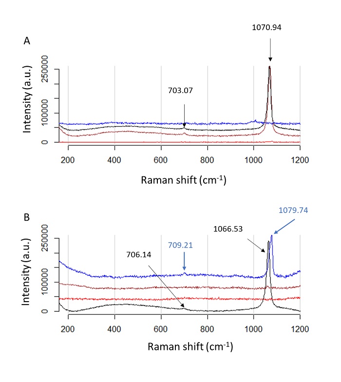 The Raman spectra of samples using CaCl2 as a cofactor are shown in Figure 7. Here we observe a single vibration mode in the region from 1060 to 1080 cm-1corresponding to which indicates only a deposition without any structured crystals formation as can be observed by SEM (Figure 3). Figure 8 shows the Raman spectra of samples using MgSO4 as a cofactor. The spectra show vibration modes in the region from 900 to 1070 cm-1 and from 230 to 640 cm-1. These vibrations modes can be assigned to ACC polymorphs. Finally, the use of CaCl2 and MgCl2 as a cofactor, do not show any crystal formation.