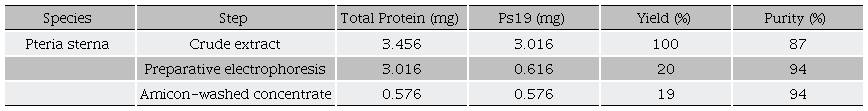 The Ps19 protein was purified by preparative electrophoresis (Figure 1B). From the four electrophoreses, a total of 576 μg of Ps19 were purified from 3.4 mg of unpurified protein present in the AIM extracted from the pulverized shell, having a protein (Ps19) with a 17 % yield and 94 % purity (Table 2).