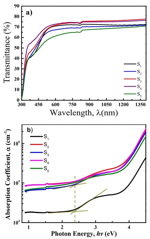 Optical transmittance spectra of VOx:Co thin films can be appreciated in Figure 1a with transmittance percentage of 65 - 75 % in the 800 -1350 nm wavelength (λ) range. The main influence of Co2+ inclusion is observed in UV-A to blue region, at 325 - 500 nm, as reported elsewhere (Hajzeri et al., 2012; Martínez-Gil et al., 2020). Furthermore, samples with larger Co2+ concentration, such as S4 and S5 , show lower transmittance at the visible region (400 - 700 nm). Optical absorption coefficient spectrum of each film sample, α(λ) (Figure 1b), is calculated from the simplified Beer-Lambert equation: , where d is film thickness and T(λ) the transmittance spectrum. The optical absorption onset (or band gap Eg ) value is estimated by intersection of two straight fitting lines. The Eg values of pure vanadium oxide and vanadium with different amounts of Co2+, are around 2.3 eV, which is very close to that previously reported for V2O5 [27]. It is also observed that the absorption coefficients of all the cobalt doped vanadium oxide thin films (from S2 to S5 ) are higher compared to the pure vanadium oxide sample (S1 ), keeping the same forms of the spectra. Higher absorption region (> 3.8 eV) in these samples should be related to the glass substrate absorption.