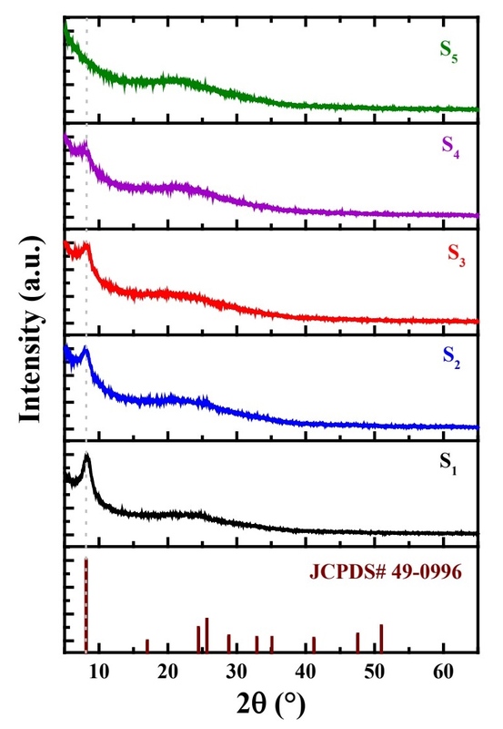 X-ray diffraction pattern of VOx film sample (S1 ) is presented in Figure 2, which appears to correspond to an amorphous material due to the broad signal around 22°, plus a monoclinic phase of HNaV6O16•4H2O with the plane orientation (100) at around 2θ ∼ 8° (JCPDS# 49-0996 (Channu et al., 2011)). This crystalline compound could be a residual from VOSO4·xH2O + NaOH, reaction and was not be eliminated during the 200 °C annealing or the thin film processing. Interestingly, after Co2+ addition, the reflection peak around 2θ ∼ 8° gradually reduces. The higher the concentration of Co2+, the smaller the intensity of that peak, until its complete elimination in the sample with the highest concentration of Co2+ (sample, S5 ). S5 shows the diffraction pattern typical of an amorphous film, hence it is a predominantly amorphous material. Since no diffraction peaks of CoOx or VCoOx compounds appear in the five VOx:Co2+ samples, it seems that low temperature annealing leads to amorphous materials, as indicated in (Hu et al., 2017; Martínez-Gil et al., 2020).