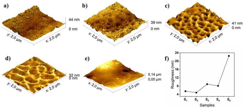 Figure 3 shows AFM three dimensional surface topography images in scales of 2 m x 2 µm of (a) S1, (b) S2, (c) S3, (d) S4 and (e) S5 VOx:Co2+ film samples. The root-mean-square roughness of the same samples is plotted in Figure 3f. The surface topography of pure VOx film (S1 ) presents lumps and the lowest roughness. As the cobalt ions are incorporated into VOx host, variations in shape and roughness are observed in AFM images. Notable changes are observed in samples S3 and S4 that exhibit a ring like morphology and increased roughness (8 - 9 nm) in comparison with S1 and S2 (4 - 5 nm) samples. sample S5 that contains the highest cobalt concentration loses the ring pattern in its surface morphology and shows the highest roughness (∼23 nm) among the five samples. Similar results are reported elsewhere, suggesting that the inclusion of Co2+ in VOx host by solution methods modifies the superficial morphology of cobalt doped vanadium oxide thin films (Fuentes-Ríos et al., 2021). Such porous morphology encourages potential use of VOx:Co2+ thin films as a cathode material for lithium battery applications (Wang et al., 2011).