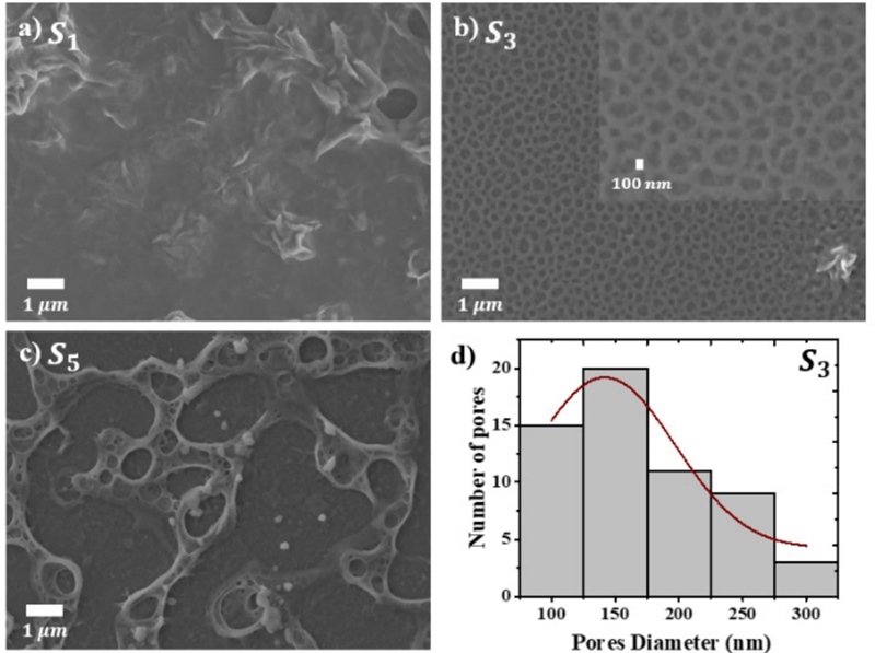 To complement the AFM results, SEM micrographs of S1 , S3 and S5 samples were analyzed and are shown in Figure 4. Without cobalt addition, vanadium oxide sample S1 shows a granular ground with shallow leaves. The S3 sample (VOx:Cobalt salt = 50:50), presents an interconnected rings or porous arrangement, very similar to the AFM image of the same sample (Fig. 3c). The pore size distribution histogram of this film sample is in Figure 4d. It shows that the pore size varies from 100 to 300 nm, and those with ~150 nm predominates. By chemical element mapping in the SEM image of sample S3 , vanadium and cobalt elements have been detected to have a homogeneous distribution inside the pores. Finally, the sample with the highest concentration of cobalt, S5 , shows an irregular porous granular pattern at the surface, and under such pattern a continuous film is observed.