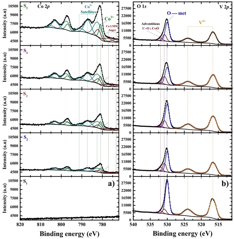 To assess the chemical state of the VOx:Co2+ film samples, an accurate peak-fitting analysis of their X-ray photoelectron spectra (XPS) (A. Herera-Gomez, no date) was carried on. Figure 5 shows the photoelectron spectra of the five samples corresponding to the (a) Co 2p and (b) O 1s and V 2p core-levels. From the Co 2p spectra (Figure 5a) we observe that the experimental data are congruent to that of the Co2+ chemical state, showing the main peak centered at 780.80 eV, but at the same time, three satellite peaks at higher binding energies that are characteristics of the Co2+ state (Yang et al., 2010; Biesinger et al., 2011; Martínez-Gil et al., 2020). It is important to mention that the relative intensities of those satellite peaks suggest that there are neighboring atoms arranged in a short-range order, possibly having distortions that deviate from the octahedral Co2+ symmetry. That is, the intensities of the satellite peaks are proportional to the molecular defects or amorphous state of the material, which correlates to the amorphous XRD results for all samples.