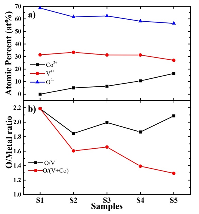 From peak intensities directly derived from the photoelectron spectra, chemical compositions of our VO2:Co2+ film samples have been determined. We have corrected the peak intensities with the appropriate physical parameters accounting for the photoemission signal attenuation due to scattering (Cabrera-German, Gomez-Sosa and Herrera-Gomez, 2016). The results expressed in terms of atomic percentage for each of the observed chemical species are presented in Figure 6a. Here, we observe that as the Co2+concentration in the precursor solution increases, the amount of Co2+ in the deposited films also increases, from 0 to 16.55 at %. On the other hand, the V4+ atomic concentration in all five samples vary slightly, from 31 at % (sample S1 ) to 27 at % (sample S5 ), which suggests that the VOx yield is high in all the probed samples. We can also observe that the percentage of oxygen atoms bonded to metals is coherent to the chemical species: VO2 and CoO, reaching 69 at % for sample S1 and decreasing up to 56.4 at % for sample S5 as the Co2+ in the films is the largest. The atomic ratio of vanadium versus cobalt (V:Co) in each sample is listed in Table 1, changing from 6.6:1 (S2 ), 4.9:1 (S3 ), 2.9:1 (S4 ) to 1.6:1 (S5 ).