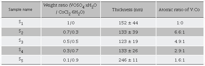 The first assessment of the possible formation of continuous VOx and VOx:Co thin films from the above mentioned precursor solutions is film thickness measurement by profilometry. Table 1 lists the five types of VOx:Co thin films with their respective thickness. In the Alpha-Step profiles of all film samples, large grains of 100 to 400 nm of height were observed and were embedded in continuous solid coatings with thickness from 133 to 246 nm.