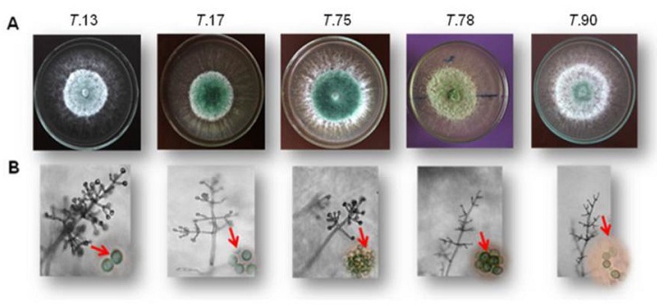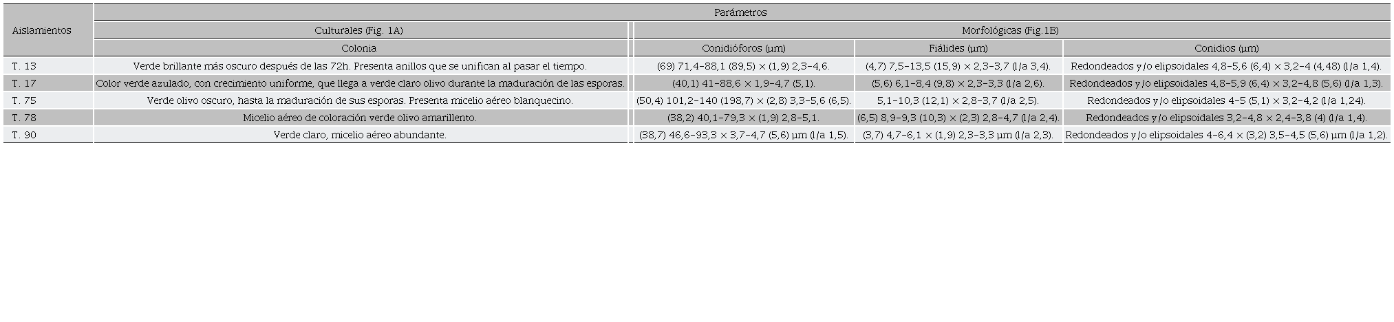 La caracterización micromorfológica de los aislamientos de Trichoderma (T.) (T.13, T.17, T.75, T.78 y T.90) se realizó tomando como base los aspectos morfológicos señalados en las claves taxonómicas referidas por Rifai (1969) y Gams y Bissett (1998): dimensiones y forma de los conidióforos, fiálides y conidios, y además la ornamentación de estos últimos; mientras que para la caracterización cultural (macroscópica) se tuvo en cuenta el color, forma y textura de las colonias.