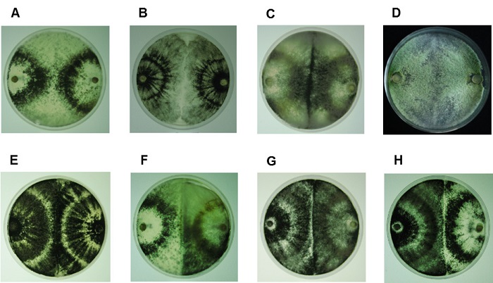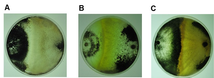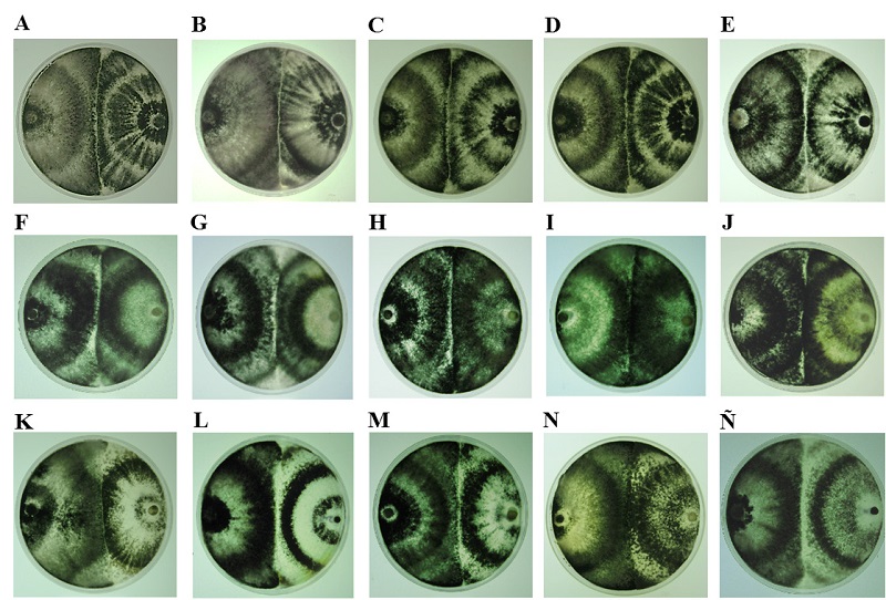 La compatibilidad entre aislados de Trichoderma se trató de demostrar sobre la base que las células vegetativas posiblemente basado en la cantidad de núcleos que poseen estas (Samuels et al., 1998), pueden formar heterocarión entre varias especies por medio de la anastomosis hifal, fusión de protoplastos o las transferencias nucleares (Barcellos et al., 2011). Precisamente por esto, la compatibilidad vegetativa permite evaluar las relaciones genéticas entre especies y/o cepas, y es un marcador útil para mostrar diversidad o variabilidad genética en diferentes especies de hongos (Ortuño et al., 2013; Moo koh et al., 2018).
