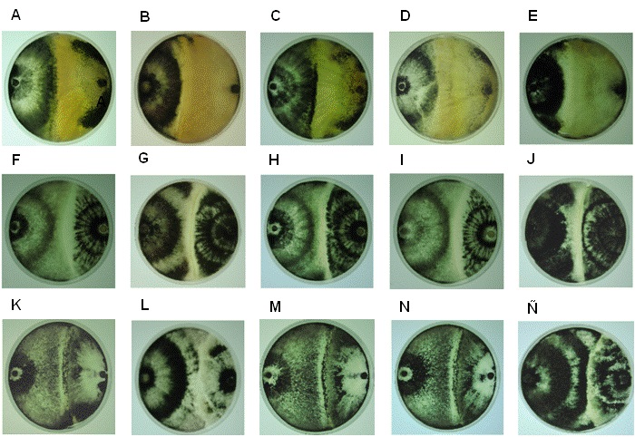 Por otra parte, en las interacciones de las cepas de T. asperellum (215D), T. atroviride (IMI206040) y T. viride (TV1) con los aislados en estudio se observaron reacciones de compatibilidad (Fig. 5A-Ñ), al igual que entre los propios aislados (Figura 6A, B y C).