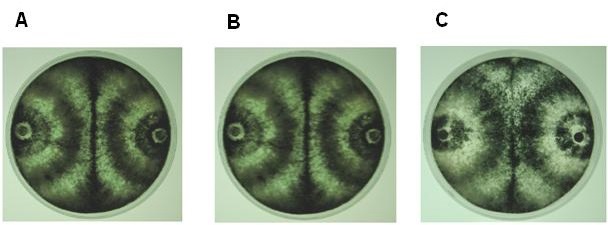 Las colonias de Trichoderma se obtuvieron a partir de suspensiones de esporas (10 µL de una suspensión con una concentración de 107 conidios.mL-1), procedentes de cultivos puros y monospóricos de tres días de sembrados en el medio de cultivo Agar Malta (AM) (BioCen). La suspensión se depositó centralmente en placas Petri de 90 mm de diámetro, que contenían medio AM (BioCen, pH 5,5), incubadas a temperatura de 20±2°C y régimen de oscuridad constante. Las evaluaciones [características de las colonias: color, forma y textura] comenzaron a partir de las 24 h de la inoculación, hasta las 72 h; se determinaron por observación visual, documentadas mediante fotografías tomadas con una cámara digital marca Canon PowerShot ELPH 180 8x (20 MP) (Proveedor Costa Rica).