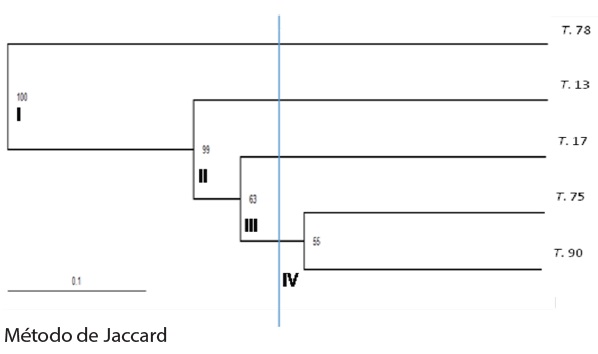 Los datos generados por los RAPD formaron cuatro grupos, una evidencia más de la variabilidad intraespecífica entre los aislados en estudio (Figura 7).