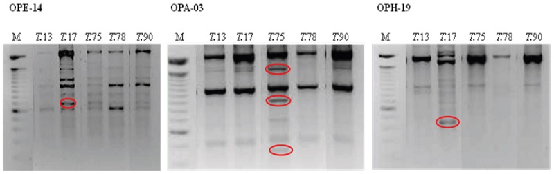 La variabilidad obtenida por RAPD entre los aislados puede ser usada para la detección de estos. El iniciador OPE-14 amplificó una banda en el aislado T.17 que lo diferencia de T.13, para T.75 con el iniciador OPH-03 se produjeron tres bandas que lo diferencian de T.78, y OPH-19, produjo una banda en T.17 que lo distingue del resto de los aislados (Figura 8). Diferencias que puntualizan dicha variabilidad. Desde otro punto de vista, estos resultados tienen importancia para el diseño de cebadores específicos, para su identificación, aspecto primordial para la autenticación, protección, y monitoreo de estos en campo.