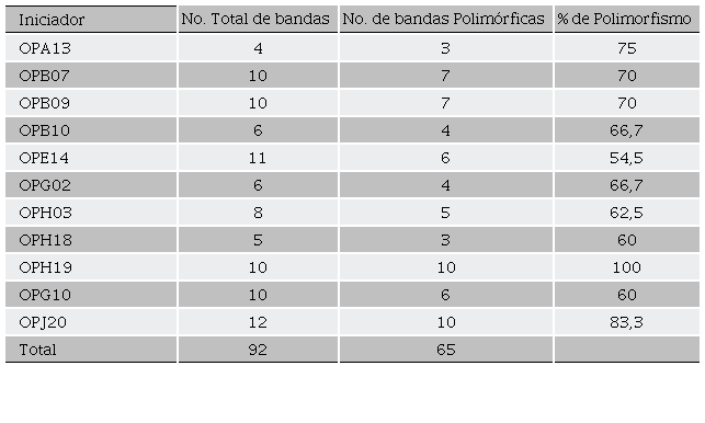 Los 11 marcadores generaron un patrón de amplificación claro y reproducible para cada aislamiento, con un total de 92 bandas reproducibles. De estas, 65 fueron polimórficas, para un 70,7 % de polimorfismo. Los iniciadores OPA-13, OPB-07, OPB-09, OPH-19 y OPJ-20 tuvieron 70 o más porciento de polimorfismo (Tabla 3), destacándose el OPH-19 con 100 % de polimorfismo.