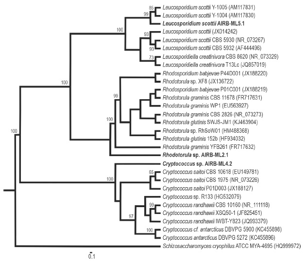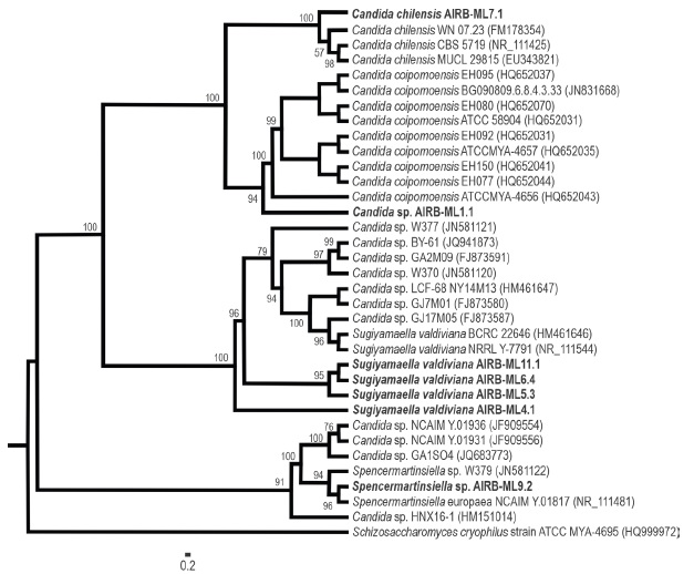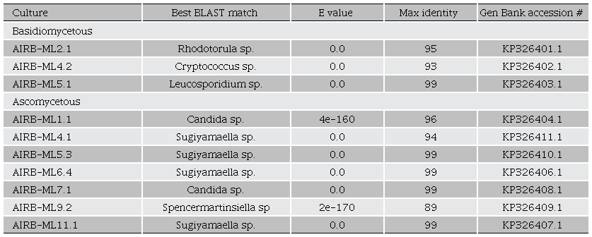 The results obtained for the isolated strains are consistent with those reported by other authors, basidiomycetes of the genera Rhodotorula (Ramírez and González 1985), Cryptococcus (Mazza et al., 2013; Lara et al., 2014) and Leucosporidium of degraded wood such as the one studied in this work. Ascomycetes have also been isolated as Sugiyamaella (Morais et al., 2013; Lara et al., 2014), Candida (Cadete et al., 2012; Guo et al., 2012; Morais et al., 2013), and Spencermartinsiella (Morais et al., 2013) among others.