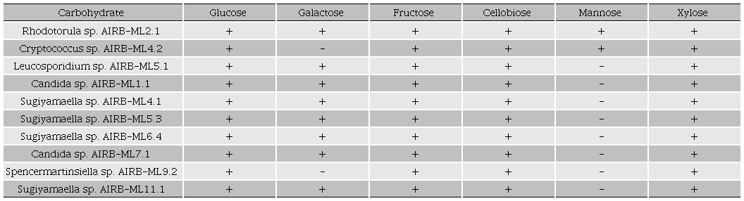 The following molecules were tested as a carbohydrates source: cellobiose, fructose, galactose, glucose, mannose, and xylose. The strains AIRB-ML2.1 (Rhodotorula sp.), AIRB-ML5.1 (Leucosporidium sp.), AIRB-ML1.1 (Candida sp.), AIRB-ML4.1 (Sugiyamaella sp.), AIRB-ML5. 3 (Sugiyamaella valdiviana), AIRB-ML6.4 (Sugiyamaella sp.), and AIRB-ML11.1 (Sugiyamaella valdiviana) were able to assimilate cellobiose, fructose, galactose, glucose, and xylose. The AIRB-ML2.1 (Rhodotorula sp.) and AIRB-ML4.2 (Cryptococcus sp.) strains were the only ones capable of metabolizing mannose. AIRB-NL4.2 (Cryptococcus sp.) and AIRB-ML9.2 (Spencermartinsiella sp.) do not assimilate galactose, but assimilated, cellobiose, fructose, glucose, and xylose.