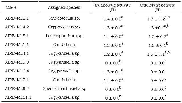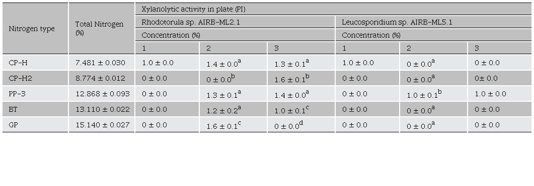 Rhodotorula sp. showed xylanolytic activity in the medium supplemented with CP-H in all tested concentrations (1, 2, and 3 % of total N) (Table 4). Significant differences were found in the xylanolytic activity of Rhodotorula sp. with 2 and 3 % of total nitrogen in the culture medium. Leucosporidium sp. presented xylanolytic activity in CP-H and PP-3 BD (Table 4).