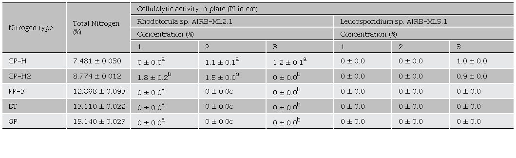 Regarding cellulolytic activity, it was observed that Rhodotorula sp. (AIRB-ML 2.1) showed plaque activity in culture media supplemented with CP-H (2 and 3 % of total nitrogen) and CP-H2 (1 and 2 % of total nitrogen) (Table 5). In comparison, Leucosporidium sp. (AIRB-ML5.1) showed cellulolytic activity in plates with CP-H (3 % of total nitrogen) and CP-H2 (2 % of total nitrogen).