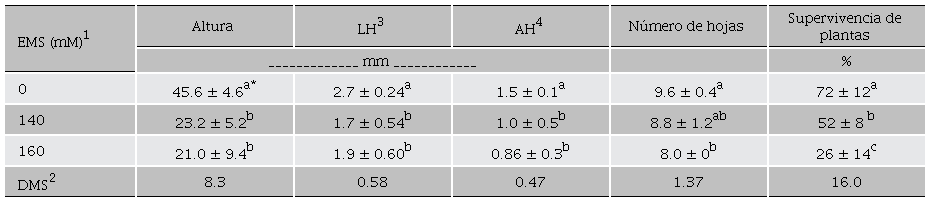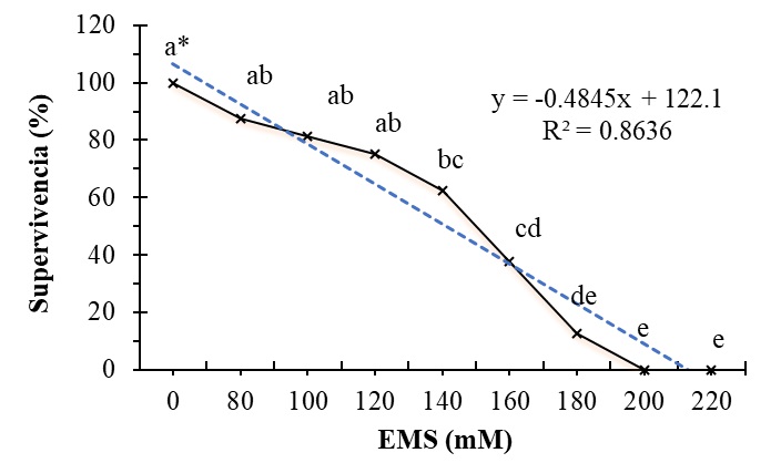 Callos de 200 mg (n = 20) fueron expuestos a nueve concentraciones EMS (0, 80, 100, 120, 140, 160, 180, 200 y 220 mM) (Sigma®-Aldrich), durante dos horas, con agitación manual cada 10 min (Bolívar et al., 2018 con modificaciones). Se realizó la inactivación del EMS con 100 mM de tiosulfato de sodio durante cinco minutos, seguido de tres lavados con agua estéril. Posteriormente, los callos fueron trasferidos a medio MS (Sigma®, 4.3 g L-1) líquido durante una hora en agitación, se secaron en papel absorbente estéril por cinco minutos. Seguidamente, se cultivaron en medio MS (2.2 g L-1) suplementado con 0.5 g L-1 de carbón activado, 30 g L-1 de sacarosa y 2.5 g L-1 de PhytagelTM, el pH se ajustó a 5.7, los cultivos permanecieron en oscuridad a 25 ± 1 °C.