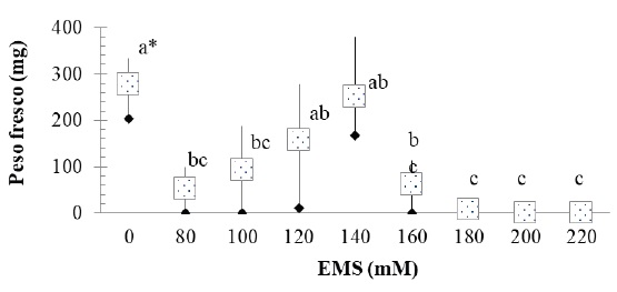Con respecto al tratamiento control sin EMS, la masa fresca del callo disminuyó significativamente 81 y 56 % con 80 y 100 mM de EMS respectivamente. Concentraciones posteriores presentaron un incremento estadísticamente similar al control hasta 140 mM, dosis posteriores inhibieron el crecimiento (160 mM, 78 %; 180 mM, 100 %) (Figura 2). Los resultados encontrados pueden deberse a un efecto hormético de EMS en el crecimiento celular, al respecto, se ha reportado que la cepa TA100 de Salmonella typhimurium (auxótrofa para el aminoácido histidina) presentan diversas respuestas a la exposición con mutágenos químicos, altas concentraciones son letales, mientras que concentraciones por debajo de la DL50 aumentan el número de colonias que mediante un mecanismos de adaptación/reparación pueden crecer en medios carentes de histidina por la inducción de mutaciones (Calabresea et al., 2011).