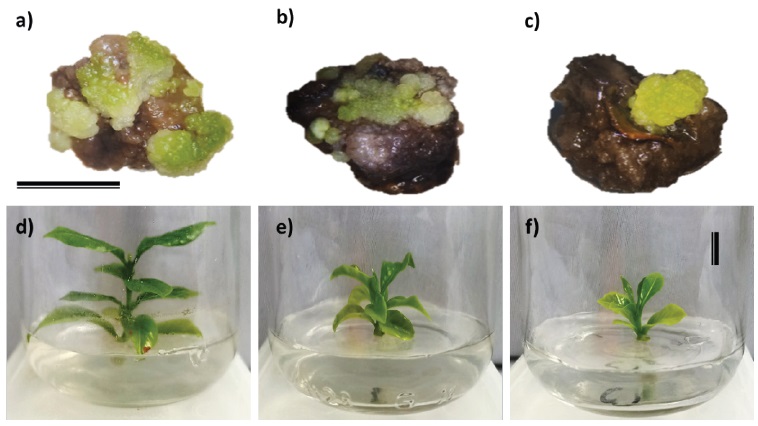 Abstract: The use of ethyl methanesulfonate (EMS) is a technology used to increase the genetic variability of cultivars. In coffee genetic improvement, EMS could generate new phenotypic and biochemical traits of agricultural importance. The objective of this research was to determine the changes in morphology and production of secondary metabolites in coffee plants generated from cell lines treated with EMS. Callus of Coffea arabica cv., Borbon were exposed to nine concentrations of EMS, and subsequently, the percentage of survival and fresh biomass were determined. Plants were regenerated on MS medium supplemented with vitamins, antioxidants, and 6-benzylaminopurine. At 20 weeks, morphological changes were observed compared to the callus not treated with EMS. Using dried leaves, secondary metabolites were extracted and quantified by high-performance liquid chromatography. Callus survival and growth decreased with increasing EMS concentration (mean lethal dose: 148.8 mM), in seedlings, it generated changes in leaf morphology, dwarfism, and the formation of three meristems, which would increase the number of leaves. Finally, 140 mM of EMS increased the content of caffeine, caffeic acid, and chlorogenic acid.
