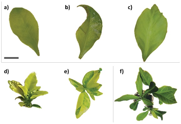 Algunas variantes somaclonales EMS (160 mM) presentaron distintas formas de ápice (puntiagudo, obtuso y tridentado) y cambios en la coloración de la hoja, entre ellos, clorosis, albinismo y mosaicos (Figura 4 d-e). Anteriormente, ya se ha reportado que EMS ocasiona cambios en el contenido y distribución de la clorofila en las hojas, relacionados con la biosíntesis de esta macromolécula (Joya-Dávila y Gutiérrez, 2020; Pawar et al., 2010); en condiciones in vitro este tipo de mutantes pueden desarrollarse al suplementar los medios de cultivo con fuentes de carbono, pero agronómicamente no tienen utilidad.