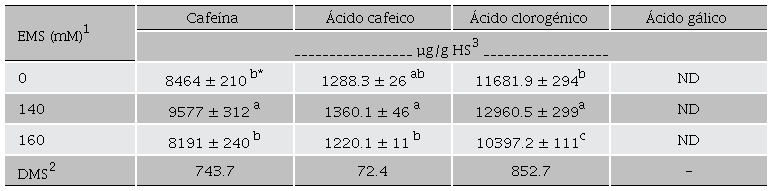 La producción basal de cafeína, ácido cafeico y ácido clorogénico aumentó 15, 6 y 11 % respectivamente en plantas tratadas con 140 mM de EMS; mientras que las plantas tratadas con 160 mM no generaron cambios significativos con respecto a las plantas control, exceptuando el contenido de ácido clorogénico que disminuyó (Tabla 2). En todos los tratamientos las señales analíticas para el ácido gálico no fueron cuantificables. Se ha reportado que el EMS incrementa el contenido de metabolitos secundarios (fructanos) y la actividad de fenilalanina amonio liasa (PAL) en plantas de agave (Reyes et al., 2019). La producción basal de metabolitos secundarios está regulada por la acción enzimática en las rutas de biosíntesis, en el caso de los fenilpropanoides la actividad catalítica de PAL es clave en el inicio de la producción de fenoles (ácido cafeico o clorogénico). La utilidad de estos metabolitos está relacionada con mecanismos de defensa bioquímica relacionados con la biosíntesis de lignina (Campa et al., 2005), que en procesos de infección limitan el crecimiento microbiano o los confina, impidiendo la difusión de toxinas y extracción de nutrientes de la célula (de Melo et al., 2020).