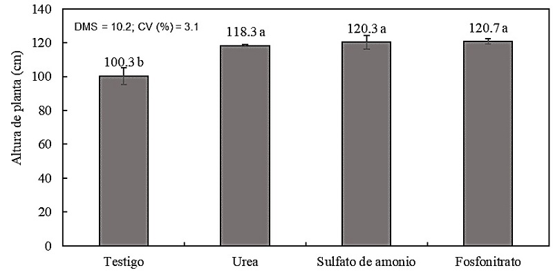La AP fue favorecida por la aplicación de las diferentes fuentes de fertilización nitrogenada, las cuales no presentaron diferencias significativas entre fuentes, solo con respecto al testigo (P > 0.05). No obstante, la aplicación de FN generó un incremento del 20.3 %, seguido de SA y la urea, con un aumento del 19.9 y 17.9 % en relación con el testigo, respectivamente (Figura 1). Bybordi y Ebrahimian (2013) y Al-Solaimanii et al. (2015) encontraron que al aumentar los niveles de nitrógeno (urea) también se acrecentaba la altura de la planta de canola. La disponibilidad de nitrógeno en el suelo independientemente de la fuente utilizada promovió el alargamiento celular de tallo (Azcón-Bieto y Talón, 2008). Lo que también ha sido reportado por Kaefer et al. (2014) y Kaefer et al. (2015), quienes no observaron diferencias al aplicar SA y urea en la altura de la planta. Contrario a lo reportado por Öztürk (2010) al presentar una mejor respuesta con urea en comparación al SA.