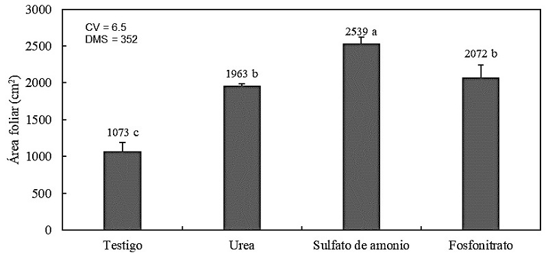 El área foliar presentó un incremento con la aplicación de las fuentes nitrogenadas, en donde se registraron diferencias significativas respecto al testigo sin aplicar (P > 0.05) (Figura 2). Esto posiblemente se deba a la presencia de nitrógeno en el suelo, ya que es un nutrimento esencial en diferentes procesos metabólicos de la planta, debido a que, estimula el crecimiento del aparato fotosintético (Azcón-Bieto y Talón, 2008). Estos resultados concuerdan con Bybordi y Ebrahimian (2013) quienes reportaron un aumento en el área foliar con el uso de diferentes niveles de urea, respecto al testigo sin aplicación, en el cultivo de canola. No obstante, se puede apreciar que, entre las fuentes de nitrógeno aplicadas, la máxima expansión foliar se logró con SA, seguido de FN, el cual no presentó diferencias con relación a la urea. Por lo que, es evidente que el sulfato de amonio fue más eficiente que la urea y el fosfonitrato en la formación y expansión de hojas; al ser, el sulfato de amonio un fertilizante ácido, disminuye el pH del suelo, proporcionando condiciones adecuadas para la asimilación del nitrógeno por la planta, además de que aporta una importante cantidad de azufre, siendo un elemento adecuado para cultivos como las brasicáceas (Salgado y Núñez, 2010; Öztürk, 2010). Por su parte Kaefer et al. (2014), registraron un incremento en la producción de área foliar en plantas de canola, con la aplicación ascendente de nitrógeno (20 a 120 kg ha-1). Sin embargo, al evaluar dos fuentes de nitrógeno (Urea y SA) no observaron diferencias significativas, resultados contradictorios a los del presente estudio en donde el SA presentó una mayor AF en comparación a la urea.