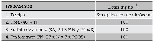 El comportamiento de la producción de biomasa total, rendimiento de grano y sus componentes fue diferente con aplicación de las fuentes de nitrógeno (Tabla 4). La biomasa total aumentó de manera significativa con la aplicación del SA, FN y urea respecto al testigo (P > 0.05). Por lo que se infiere, que el suministró de nitrógeno indistintamente de la fuente utilizada estimula la acumulación de biomasa en el dosel vegetal, ya que el N está relacionado en diferentes procesos metabólicos como la síntesis de proteína, aminoácidos y ácidos nucleicos (Kaefer et al., 2014; Al-Solaimani et al., 2015). En estudios realizados por Kaefer et al. (2015), Ma y Zheng (2016) y Chamorro et al. (2017), observaron un aumento en la biomasa total al evaluar Urea (100 kg ha-1 de N) y SA respecto a la nula fertilización. Por su parte López et al. (2019), quienes evaluaron diferentes fuentes de nitrógeno sobre la biomasa total encontraron diferencias significativas, principalmente con el uso de SA. Contrario a lo observado en el presente estudio.
