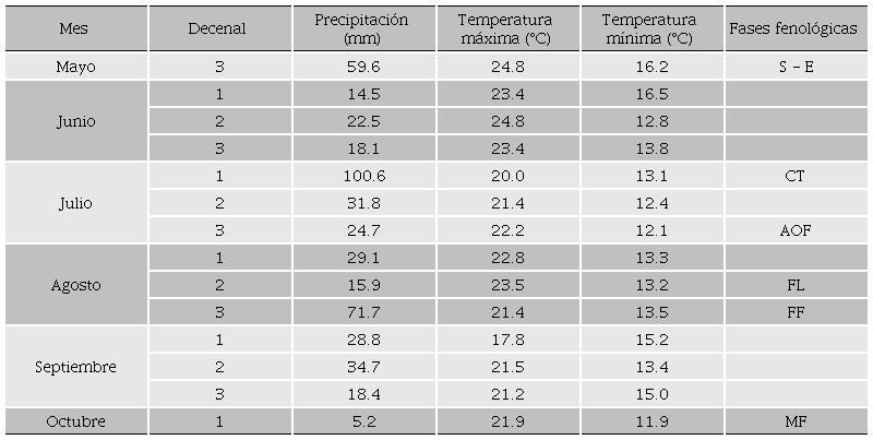Durante el desarrollo del cultivo las temperaturas máximas y mínimas oscilaron entre 24.8 y 11.9 °C. Es importante señalar, que la temperatura máxima estuvo por debajo del límite mínimo permisible que mencionan Panozzo et al. (2014) y Escalante-Estrada et al. (2016). La precipitación acumulada fue de 475 mm y la evaporación de 493 mm. Cabe destacar que de S a FL la acumulación de la precipitación fue de 316 mm, mientras que de FL a MF fue de 158 mm.